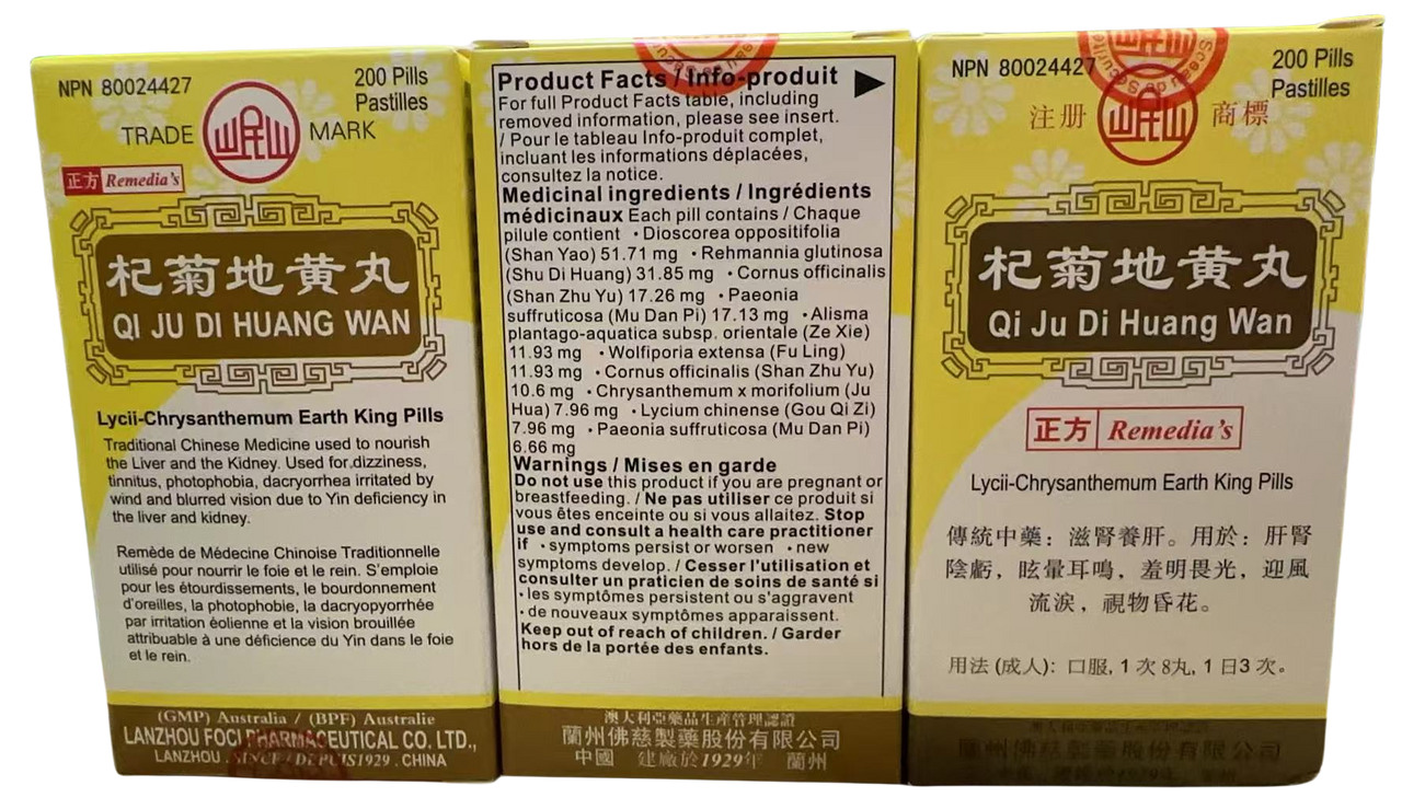 Qi Ju Di Huang Wan 杞菊地黄丸 (Blurred Vision Support) Concentrated 200 pills/bottle, is a Traditional Chinese Medicine that used to nourish the Liver and the Kidney. It can help relieve yin deficiency in the liver and kidney.